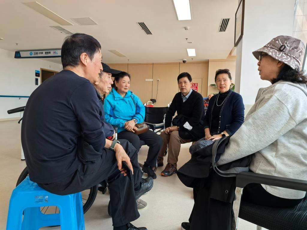 3月28日,离退休工作处退休第五党支部书记佘沅和宣传委员兼纪检委员郑玲一行前往成都,专程探望慰问异地居住的离退休老领导、老党员。在成都市第八人民医院,佘沅一行召集长期居住成都的老党员李萍、敖德萨一同看望了入党 70 年的王士杰老院长及家属张瑞先老师,与他们亲切交谈,仔细询问身体状况和生活情况,耐心倾听需求,叮嘱他们安心休养、保重身体。支部还与李萍、敖德萨深入交流,详细了解他们的生活和健康情况,大家共忆往昔岁月,共话情谊绵长。王院长对组织的关心关怀表示由衷感谢,一再要求支部转达对学校的感谢。王院长动情地说:“我就喜欢人多热闹,感谢组织一直记挂着我们外地居住的同志。”李萍、敖德萨也表示,虽然人在外地,也时刻牵挂学校,祝福学校发展越来越好。